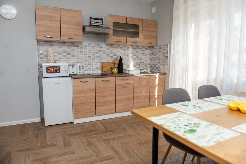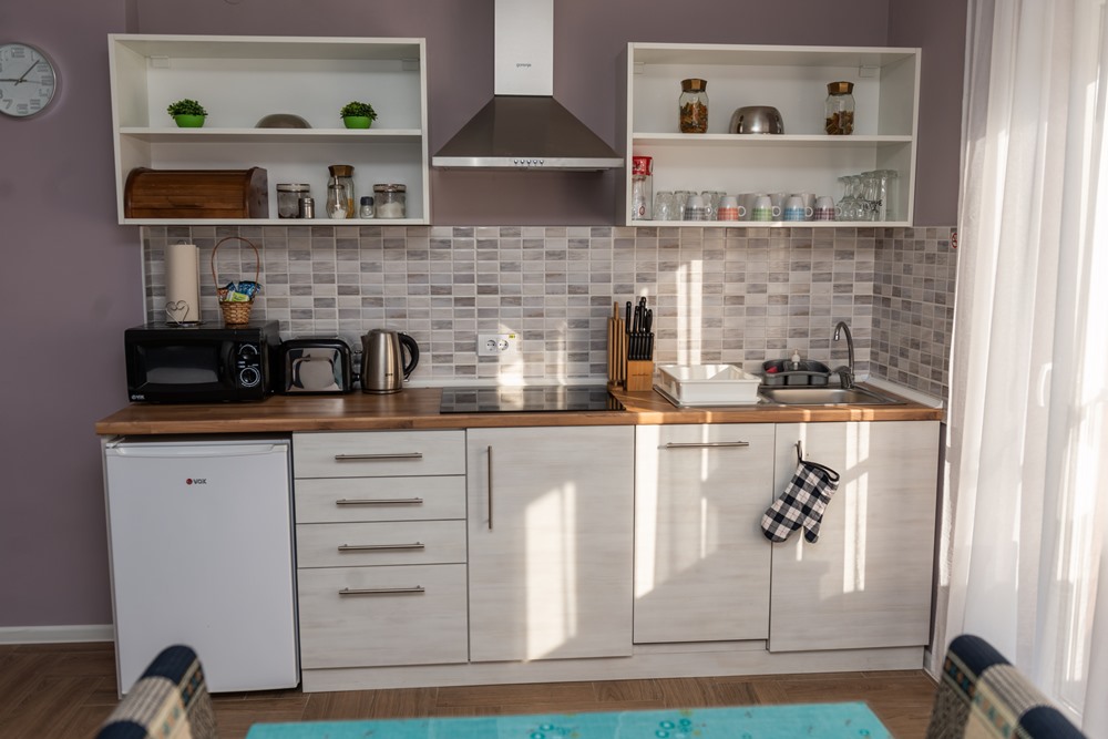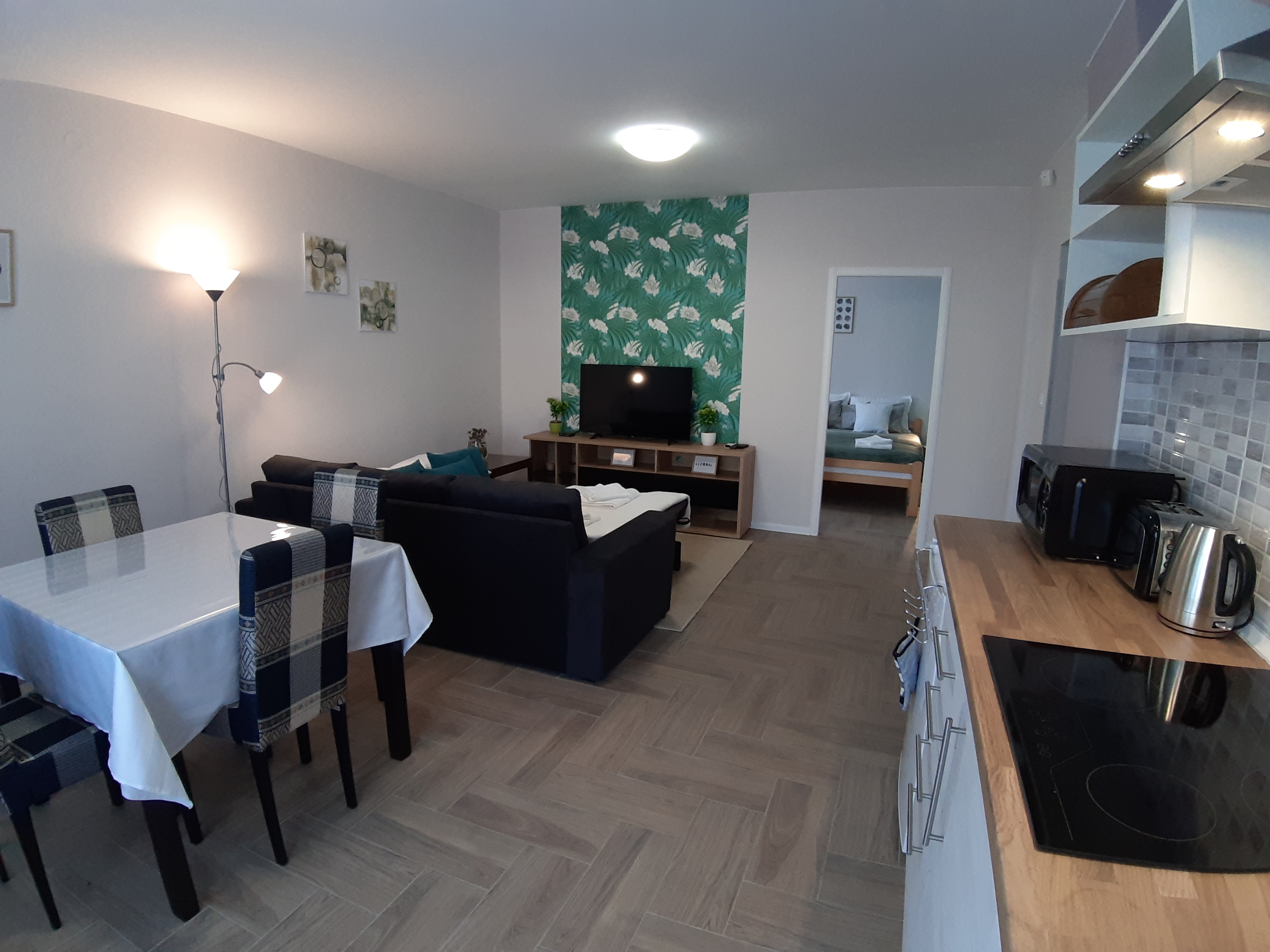 The most spacious apartment of our apartment house in Palic is located on the ground floor, where everything is given for rest, relaxation and entertainment. Covering a total of 43 square meters, it has an open-space living room with kitchen and dining room, a bedroom, a bathroom and an entrance hall, as well as a 12-square-meter terrace with direct access to the garden.