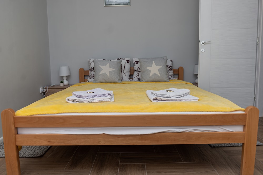 The sunny yellow apartment of our apartment house in Palic is located on the first floor, where everything is provided for rest, relaxation and entertainment. The apartment, which covers a total of 43 square meters, has an airy living room-kitchen-dining room, a bedroom, a bathroom and an entrance hall, and it also has two balconies of 4 square meters each.