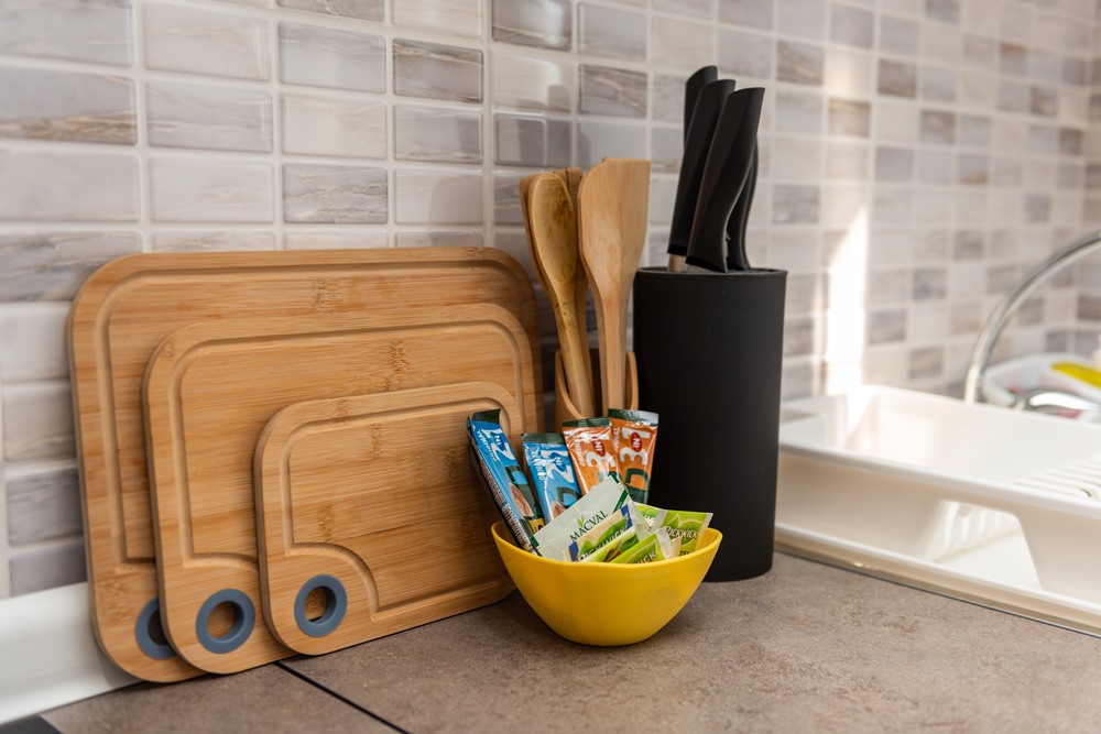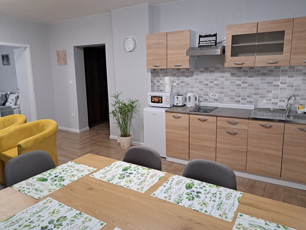 - savremeno opremljena kuhinja (staklokeramička ploča sa dva dela, aspirator, toster, kuvalo za vodu, mikrotalasna pećnica, frižider) sa svim potrebnim posuđama za 1 do 5 osoba