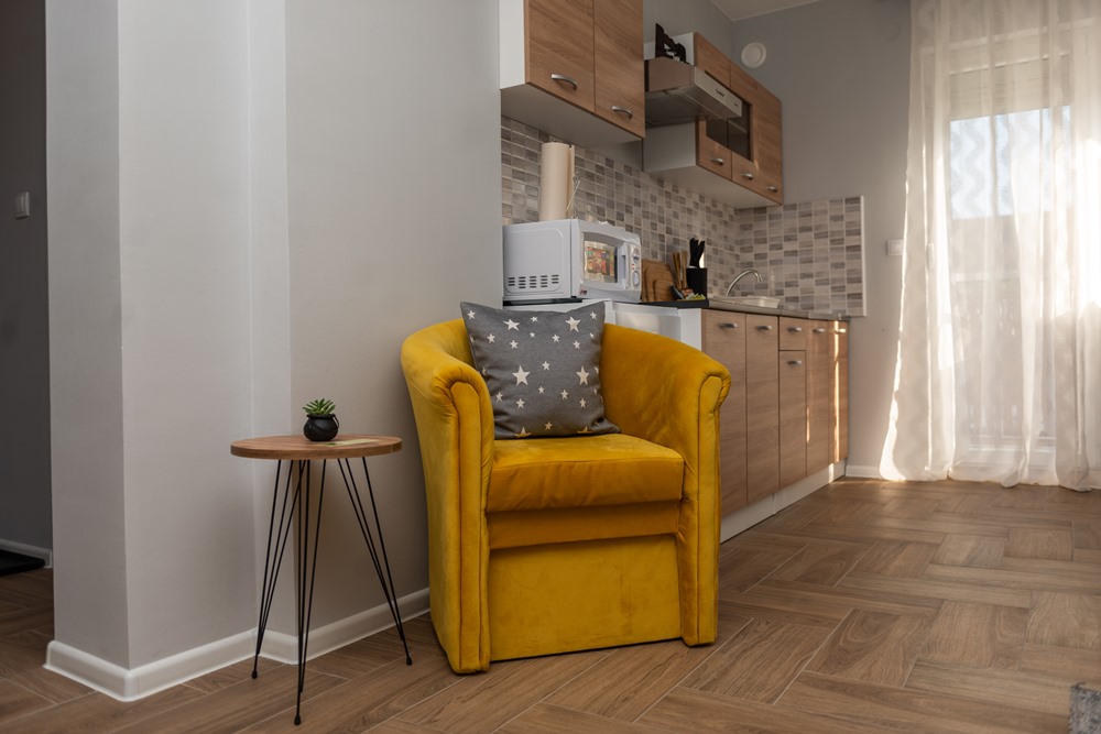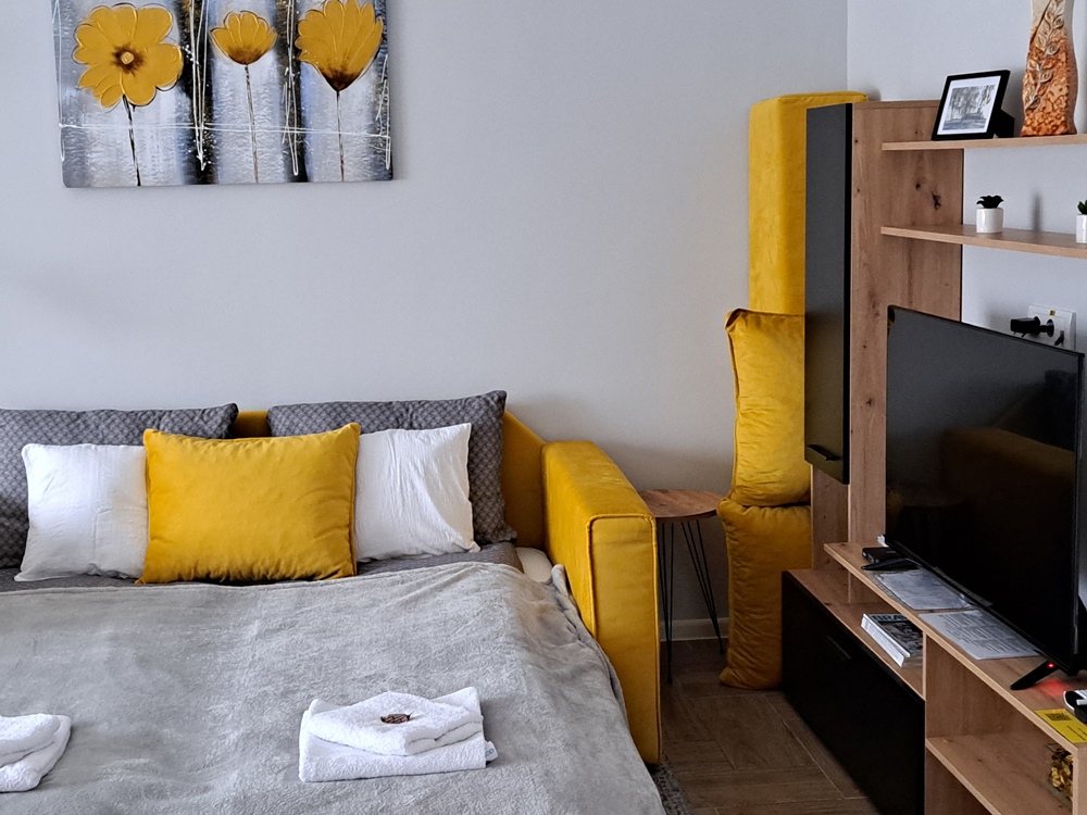 Sunčano žuti stan naše apartmanske kuće na Paliću nalazi se na prvom spratu, gde je sve obezbeđeno za odmor, opuštanje i zabavu. Apartman, koji se prostire na ukupno 43 kvadrata, ima prozračan dnevni boravak-kuhinju-trpezariju, spavaću sobu, kupatilo i ulazni hol, a poseduje i dva balkona od po 4 kvadrata.